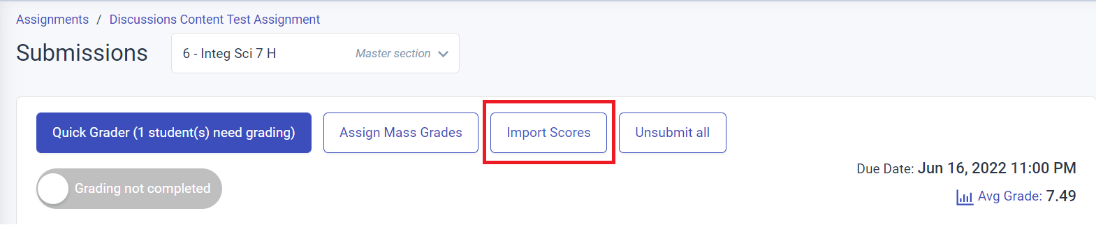- From the submissions page of the desired activity, click on the Import Scores button.