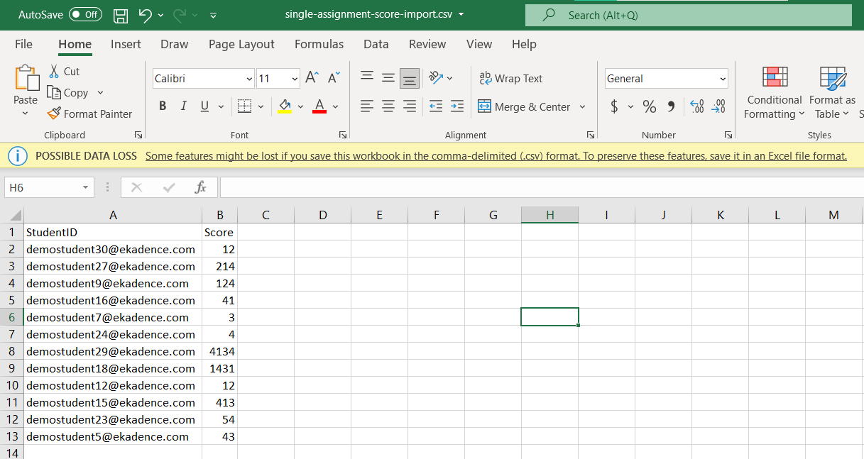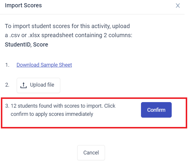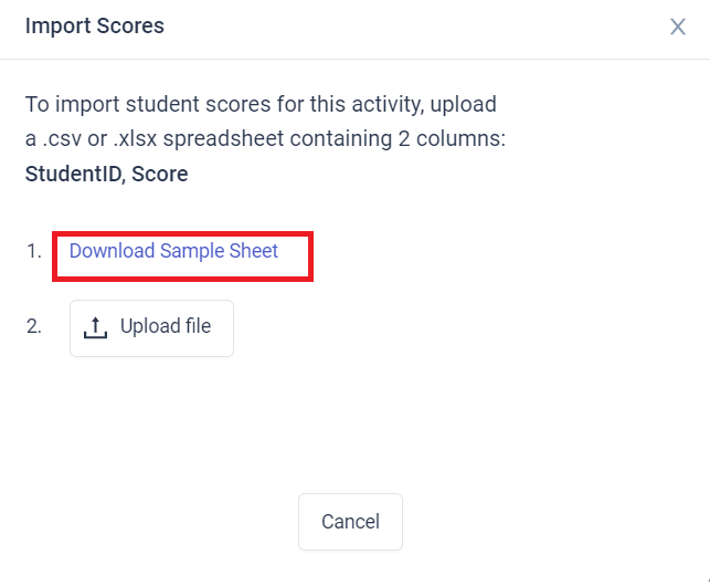- Teachers can then upload a .csv or .xlsx file with the scores that will be imported. Columns must be labeled with student IDs or student emails "StudentID" and the column with the scores "Score." A sample file with the column labels can also be downloaded for reference.