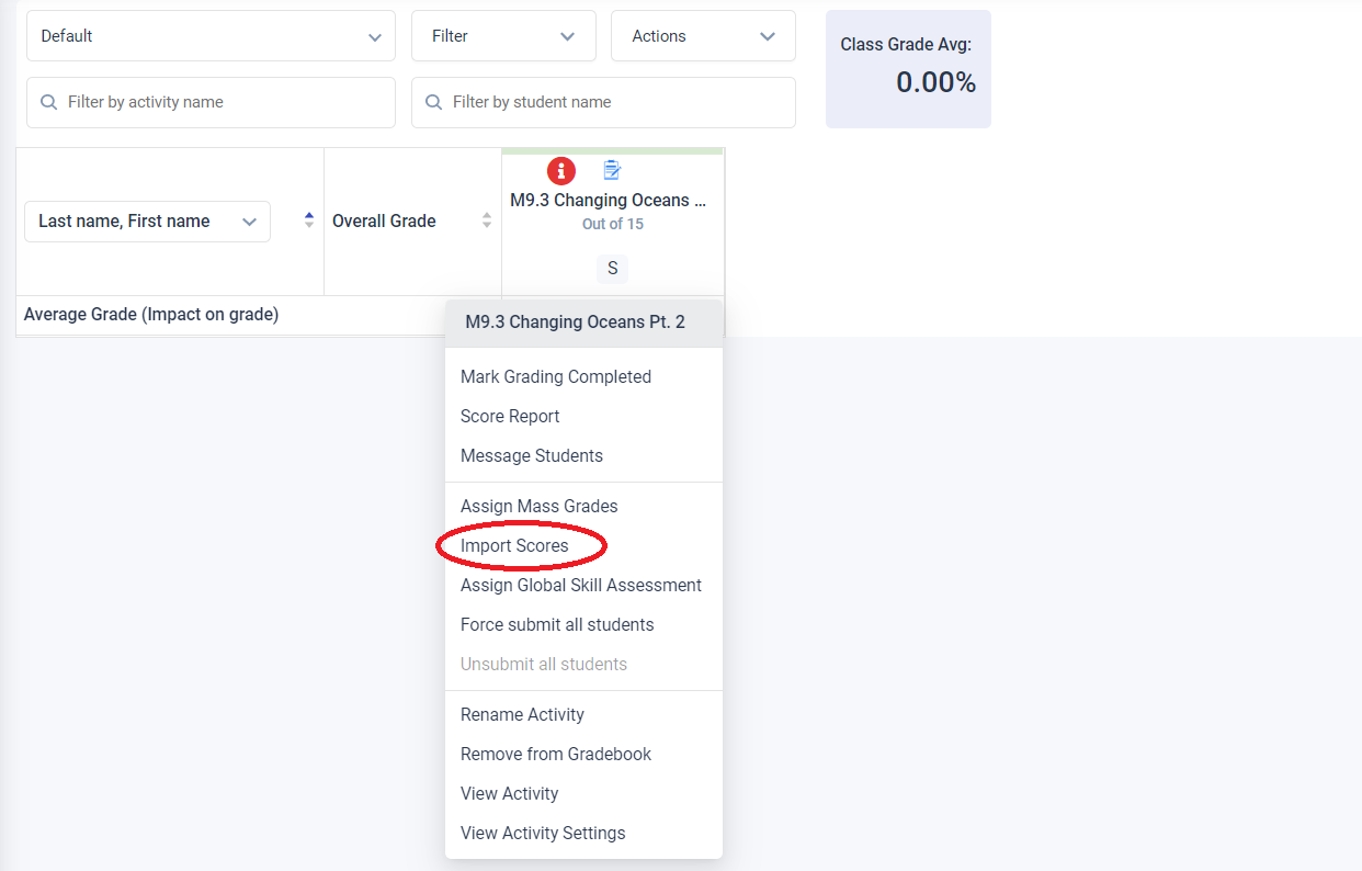 - From the Gradebook, hover over the desired activity and click on the Import Scores option.
