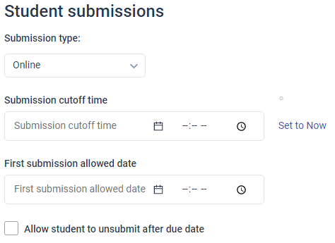 - First submission allowed date - Teachers can set a time for when students are allowed to make the first submission. For example, this could be used for when the teacher would like the student to submit the activity at a later date from the publish date.