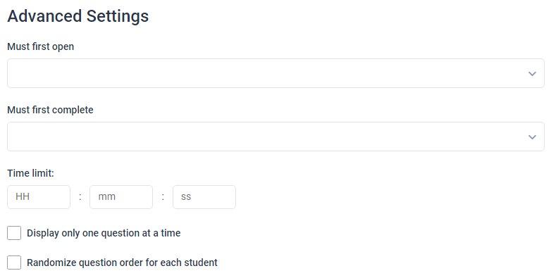 The final settings that teachers will find when creating an activity are the Advanced Settings. Assignments and assessments will both have the same advanced settings while discussions will have one different setting than the other two activities.