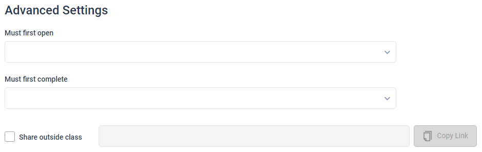 - Must first complete - The student will have to complete a different activity in order to be able to open the newly created activity.