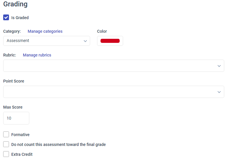 Note: Checking the box for is or is not graded will determine if the activity is shown in the gradebook or not - Grading Category with a color code for the category - Please see our article on Grading Categories for more details
